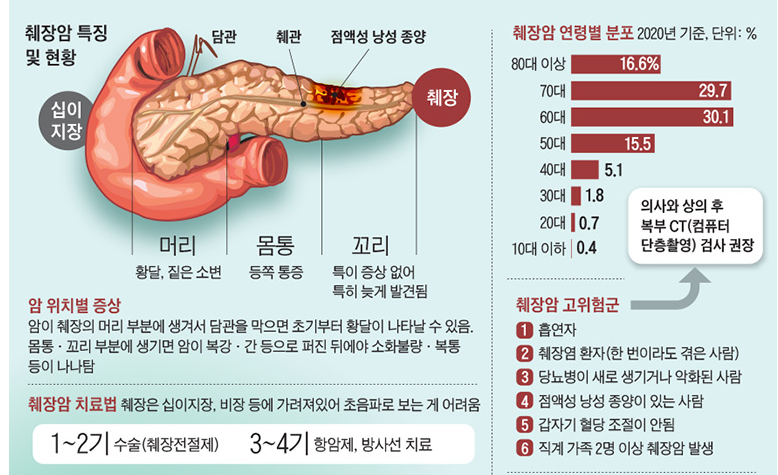 췌장암은 예후가 매우 나쁜 암으로, 5년 생존율이 5% 이하입니다. 이는 대부분의 췌장암이 이미 진행된 후에 진단되기 때문에, 진단 당시 수술이 가능한 경우가 20% 미만이며, 수술로 암을 완전히 제거하더라도 미세한 전이로 인해 생존율이 크게 개선되지 않는다는 이유 때문입니다. 또한, 항암제와 방사선 치료에 대한 반응도 다른 암에 비해 낮습니다.