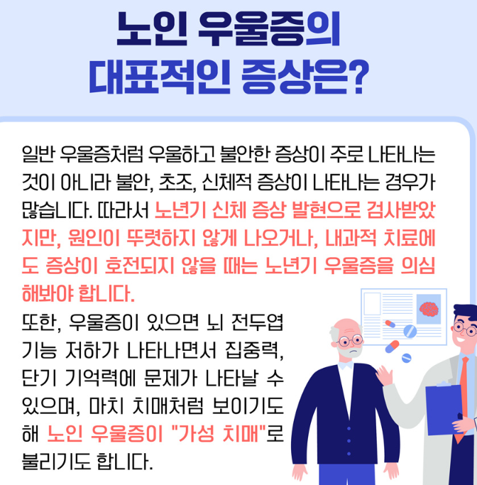 노인 우울증의 증상은 특징적입니다. 일반적으로 우울증에서는 우울감, 흥미 상실, 의욕 저하 등이 나타나지만, 노인에서는 주관적인 우울감 대신 모호한 신체 증상, 불면, 인지 기능 저하, 성격 변화 등이 더 흔합니다. 이 때문에 노인 우울증은 초기 발견이 어렵고, 여러 병원을 돌아다녀도 치료가 잘 되지 않는 경우가 많습니다.때로는 인지 기능 저하로 인해 치매로 오해받기도 합니다. 또한, 나이가 많다는 이유로 치료 의지가 낮거나 여러 부담감 때문에 치료를 거부하는 경우도 흔합니다.
