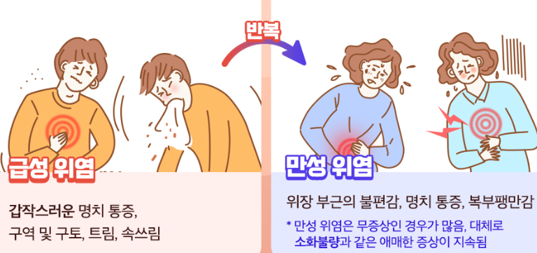 급성 위염의 경우 명치 부위의 갑작스러운 통증, 구역질, 구토 등의 증상이 나타납니다. 반면 만성 위염은 무증상인 경우가 많으며, 소화불량, 상복부 통증, 복부 팽만감, 구역질, 속 쓰림 등의 증상이 나타날 수 있습니다.