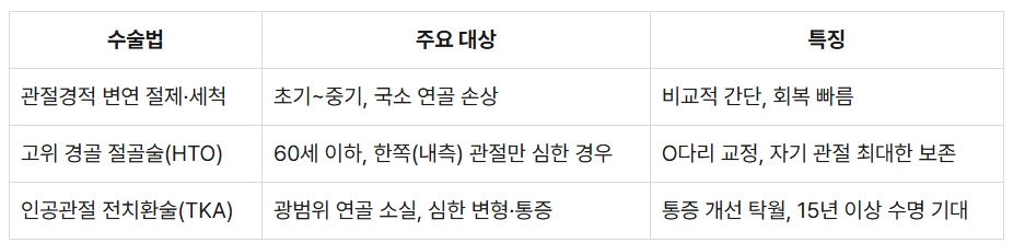 무릎 관절염은 ‘완치’보다는 통증 경감과 기능 유지가 목표입니다. 크게 보존적 치료와 수술적 치료로 나눕니다.