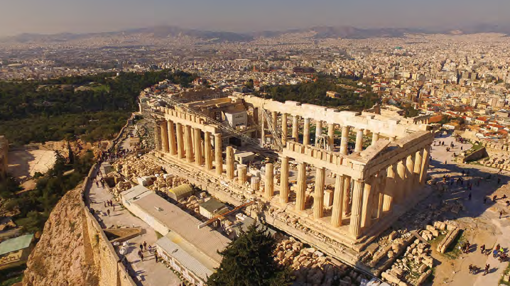 또 완벽한 수직이 아니라 안쪽으로 약간 기울었는데, 이런 구조는 모두 착시 현상이 일어날 것을 예측하고 의도한 것이다. 완전한 수직과 수평으로 건물을 지으면 눈의 착각 때문에 오히려 안정된 비례감을 해친다는 사실을 수천 년 전 그리스인은 이미 알고 있었던 것이다. 건축 구조상으로도, 관람객의 눈에도 완벽한 파르테논 신전은 1687년 베네치아 군대의 폭격으로 내부 공간 대부분이 파괴됐다. 여전히 복구 중이며, 이때 모아놓은 돌조각에 번호를 새겨 관리한다. 설명을 들으며 고대 그리스인의 유산에 감탄하다 보니 한낱 돌멩이와 부서지는 기둥, 건물터 역시 쉽사리 지나칠 수 없어 호기심이 생긴다.
