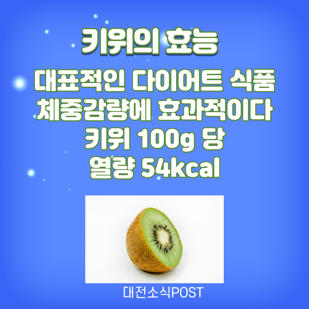 키위는 대표적인 다이어트 식품입니다. 일본에서 키위 다이어트 열풍이 불 정도로 인기있는 과일입니다. 키위를 섭취하면 체중감량에 효과를 볼 수 있습니다. 키위의 열량은 100g당  54kcal로 열량이 매우 낮고 섬유질 함량이 높습니다. 키위는 인슐린 생성을 조절하여 몸에 지방이 저장되지 않도록 해줍니다. 특히 키위의 껍질엔 섬유질 50%이상, 엽산은 32% 이상을 함유하고 있어 잔털을 긁어낸 후 흐르는 물에 씻어 껍질 채 먹는 것이 영양학적으로  좋습니다.