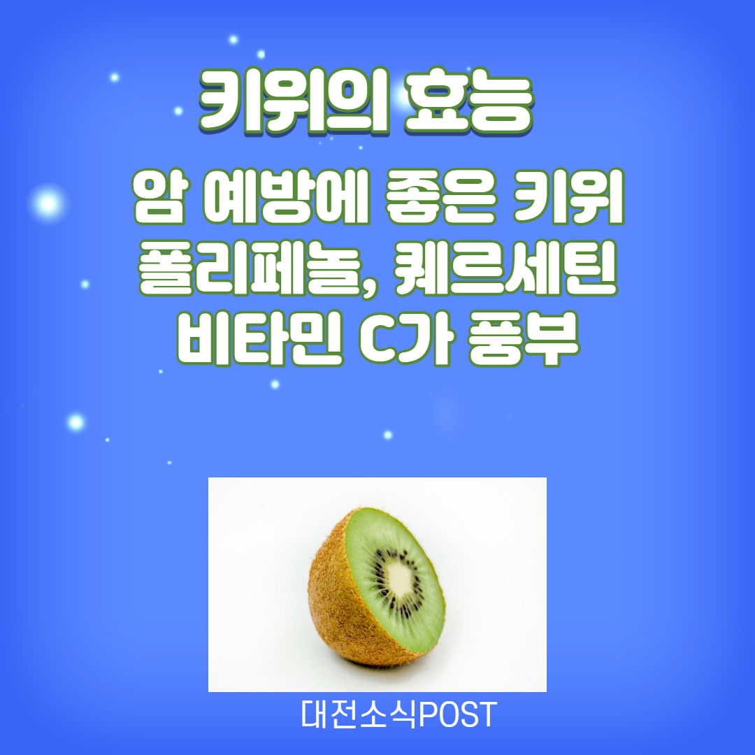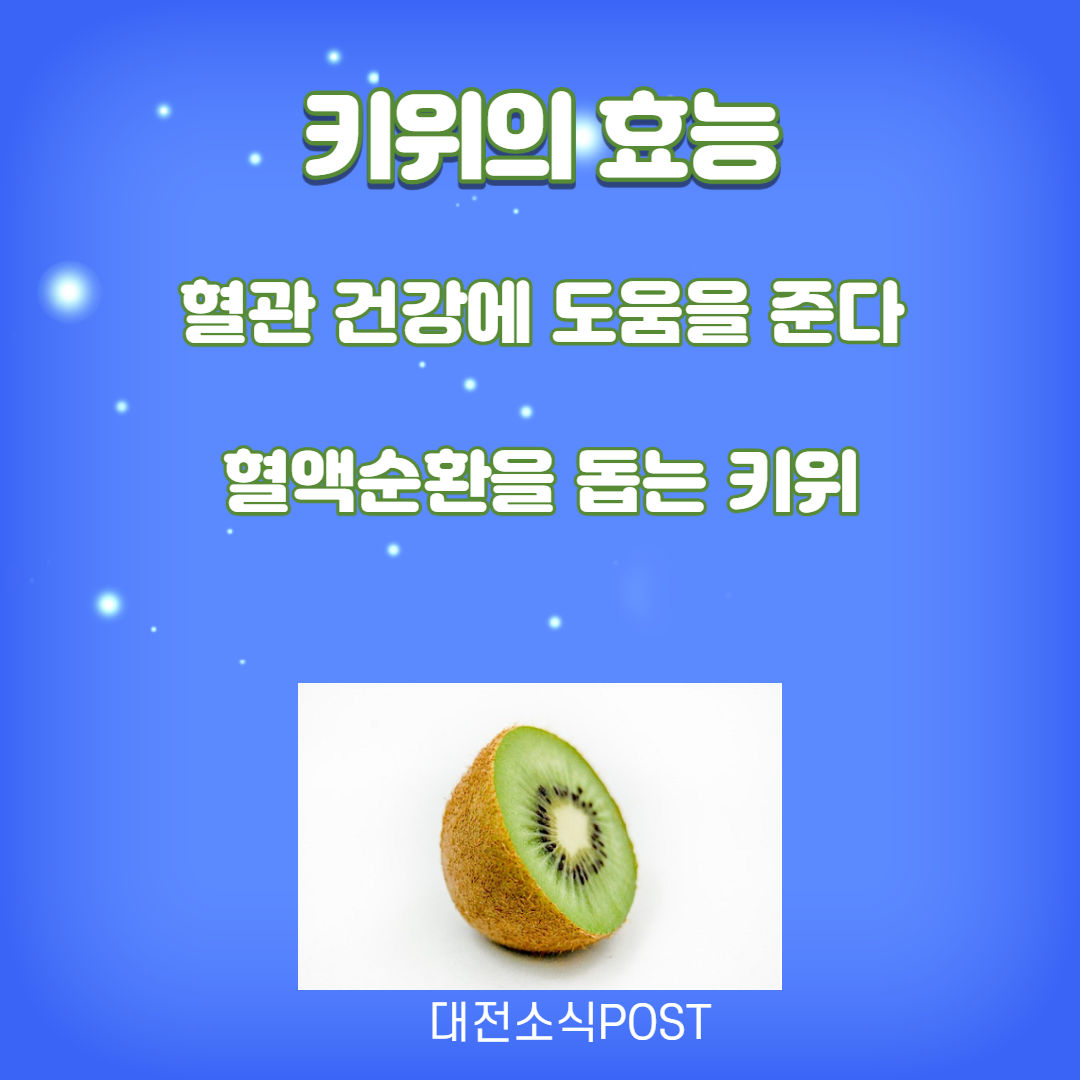 키위에는 비타민C, 비타민E, 베타카로틴 등의 항산화 성분이 혈액순환과 각종 혈관 질병을 예방하는데 효과적인 도움을 줍니다. 특히 키위의 칼륨 성분이 나트륨을 몸 밖으로 배출하여 혈압을 낮추는 효능이 있으며, 미국 심장학회의 연구에 따르면 하루에 키위를 3개 먹으면 혈압을 낮출 수 있다고 합니다.