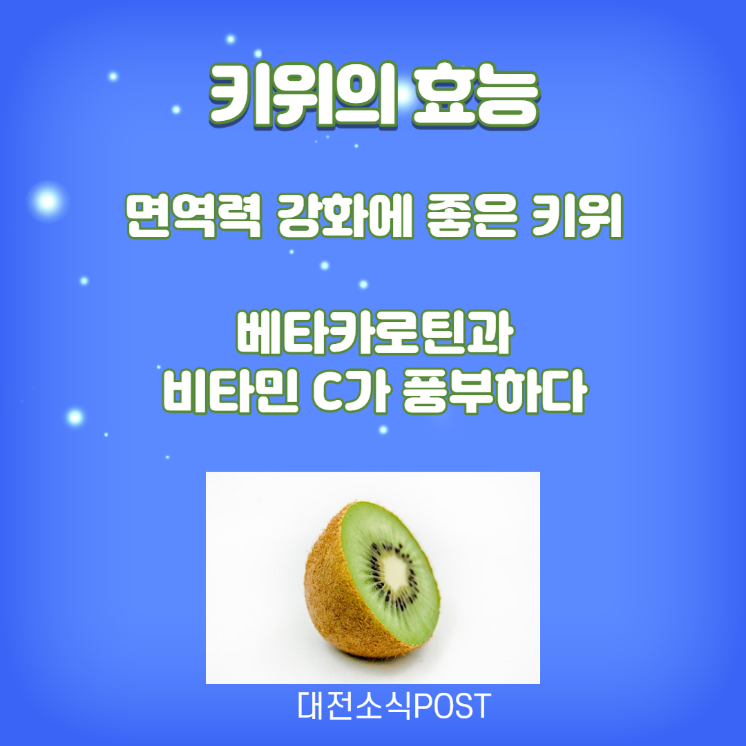 또한 키위는 식이섬유 펙틴이 풍부하여 당이 흡수되는 속도를 줄여주어 혈당의 급격한 상승작용을 억제합니다. 또한 키위에 함유된 루테인과 제아틴은 눈의 피로를 풀어주고 망막으로 들어오는 자외선을 차단하여 노화에 의한 시력손실을 완화하는데 효과적입니다. 또한 키위는 체내에서 비타민A로 변환되는 베타카로틴이 풍부해 야맹증, 백내장 등을 예방하는 효과가 있습니다.