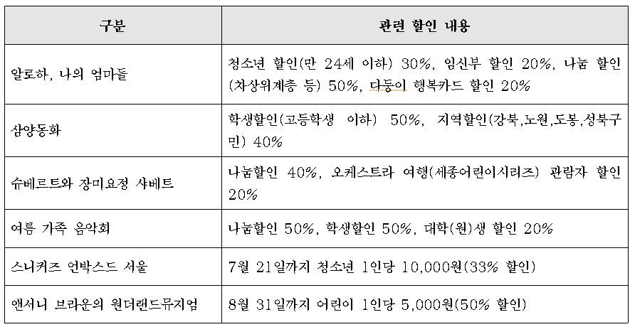 세종문화회관이 엄선한 여름방학프로그램에는 청소년과 가족 등을 위해 다양한 티켓 할인을 제공하여 온 가족이 함께 시원한 여름 문화 나들이가 될 수 있기를 기대한다. 문의 세종문화티켓 02-399-1000반응형'문화여행기행' 카테고리의 다른 글