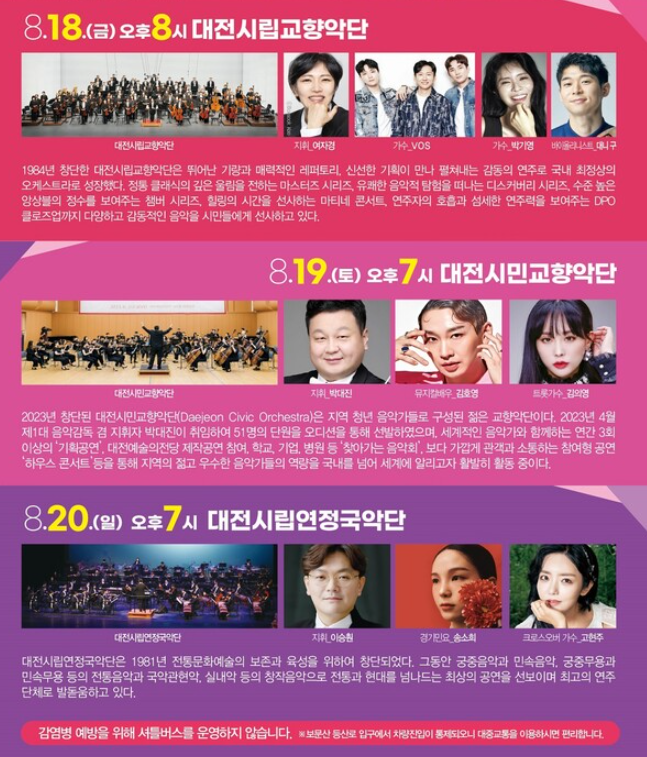 이어서 대전시민교향악단(지휘 박대진)의 연주와 함께 미스트롯2에서 입상한 캡사이신 보이스 김의영, 독보적인 뮤지컬배우 김호영이 출연해 흥을 돋운다.