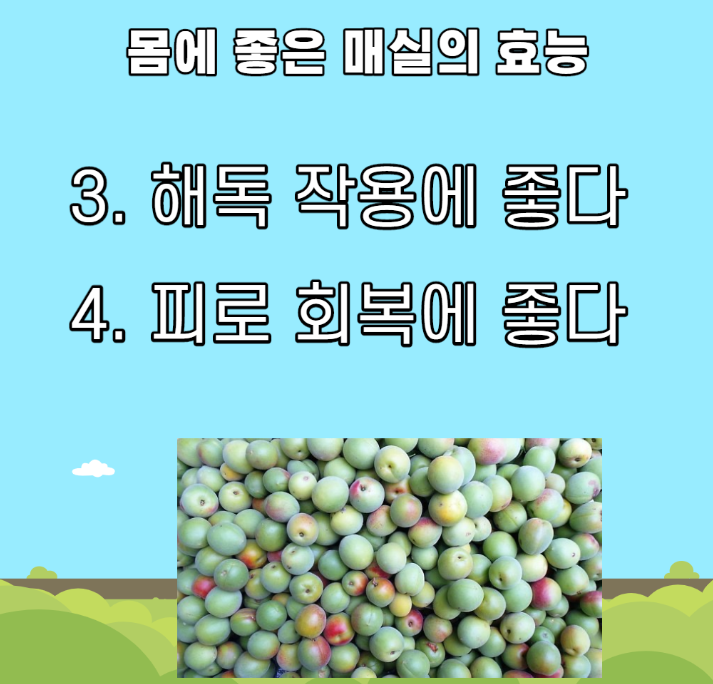매실은 삼독이라 하여 '음식물의 독, 물의 독, 피 속의 독'을 없앤다는 말이 있습니다. 매실에 포함된 '피크리산'이라는 성분은 독성물질 분해에 효과가 좋다고 합니다. 매실을 섭취하면 몸에 쌓인 독을 해독할 수 있습니다. 또한 매실에는 암을 예방하고 치료하는데 도움을 주는 각종 비타민과 무기질이 풍부해 최근엔 함암식품으로도 각광을 받고 있습니다.