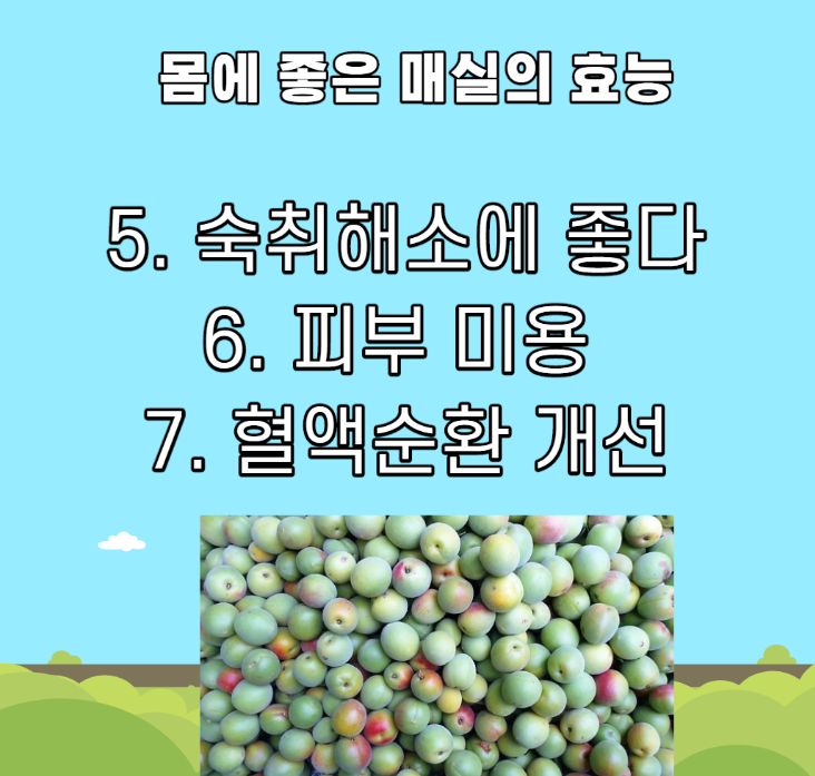 우리몸에 독성물질을 해독하는 장기는 바로 '간'입니다. 매실에 들어있는 '피루브산'이라는 성분은 간의 해독작용을 도와 손상된 간의 회복을 돕습니다. 음주후에 매실농축액을 물에 타서 마시면 숙취해소에 도움이 됩니다.