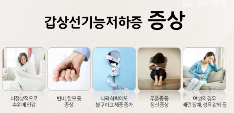 갑상선 호르몬이 부족하여 발생하는 질환으로 선천적이거나 어릴 때 발생하면 크레틴병이라 불리며 지능 저하와 성장 장애를 초래합니다. 성인이 되어서 발생하면 피로감, 체중 증가, 부종, 목 쉼 현상, 추위에 민감해짐, 기억력 감퇴 및 월경과다 등의 증상이 나타납니다.