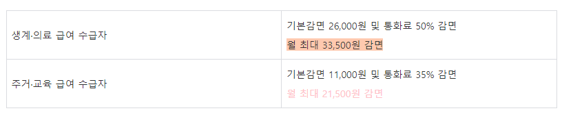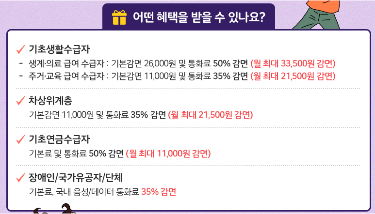 기본감면 11,000원 및 통화료 35% 감면 (월 최대 21,500원 감면)
